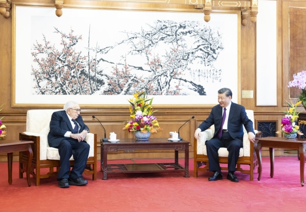 習近平指出,基辛格博士剛剛度過百歲生日,你訪問中國已經一百多次。這兩個“一百”加在一起,使你這次訪華具有特殊意義。52年前,中美兩國處在一個關鍵轉折點,毛澤東主席、周恩來總理同尼克松總統和你本人以卓越的戰略眼光,作出中美合作的正確抉擇,開啟了中美關系正常化進程,既造福了兩國,也改變了世界。中國人重情講義,我們不會忘記老朋友,不會忘記你為推動中美關系發展、增進中美兩國人民友誼作出的歷史性貢獻。