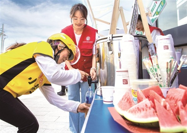針對高溫天氣,內蒙古自治區(qū)呼和浩特市玉泉區(qū)設立“紅蜂驛站清涼角”,為外賣騎手等戶外工作者提供礦泉水、西瓜等。圖為黨員志愿者為外賣騎手提供綠豆湯。 圖片來源:視覺中國