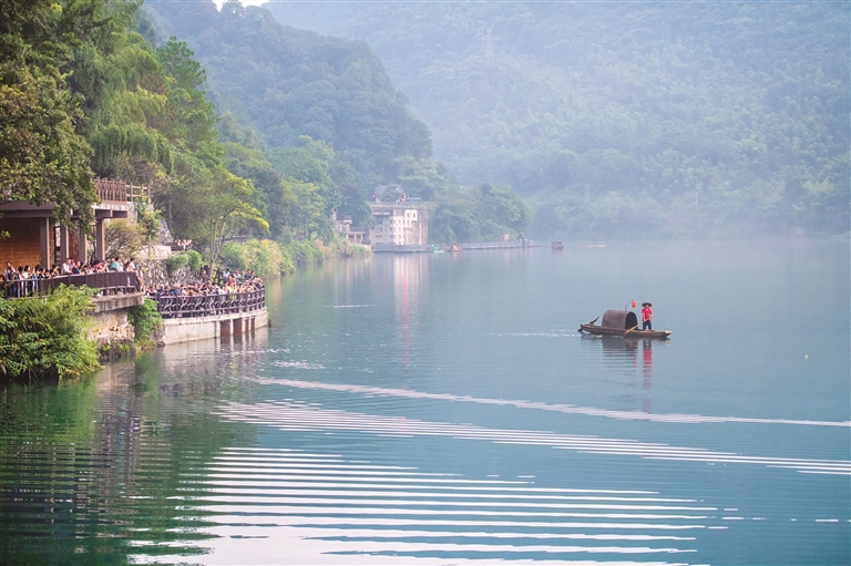 良好生態環境是最普惠的民生福祉。湖南省資興市堅持走生態惠民綠色發展之路,狠抓生態環境保護工作,吸引全國各地游客紛至沓來。圖為日前,在資興市東江湖風景區,游客在觀看漁夫撒網表演。新華社記者 謝奔 攝