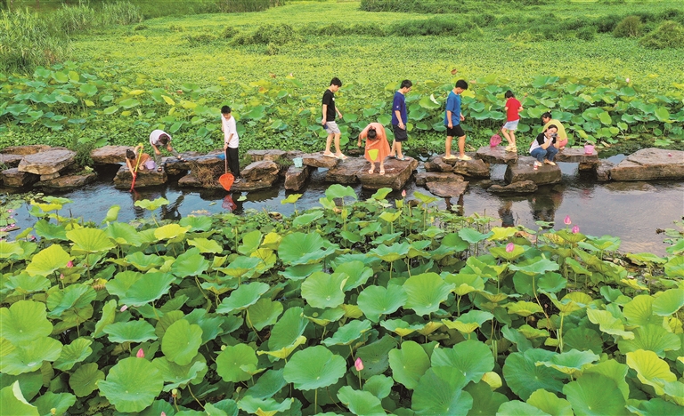 黨的十八大以來,生態(tài)文明建設(shè)取得顯著成效,綠水青山帶給人民越來越多的幸福感。圖為7月11日,江蘇宿遷,泗洪縣大樓街道城北尾水濕地公園荷香四溢,家長帶著孩子們在荷塘疊石上捉小魚蝦。圖片來源:視覺中國