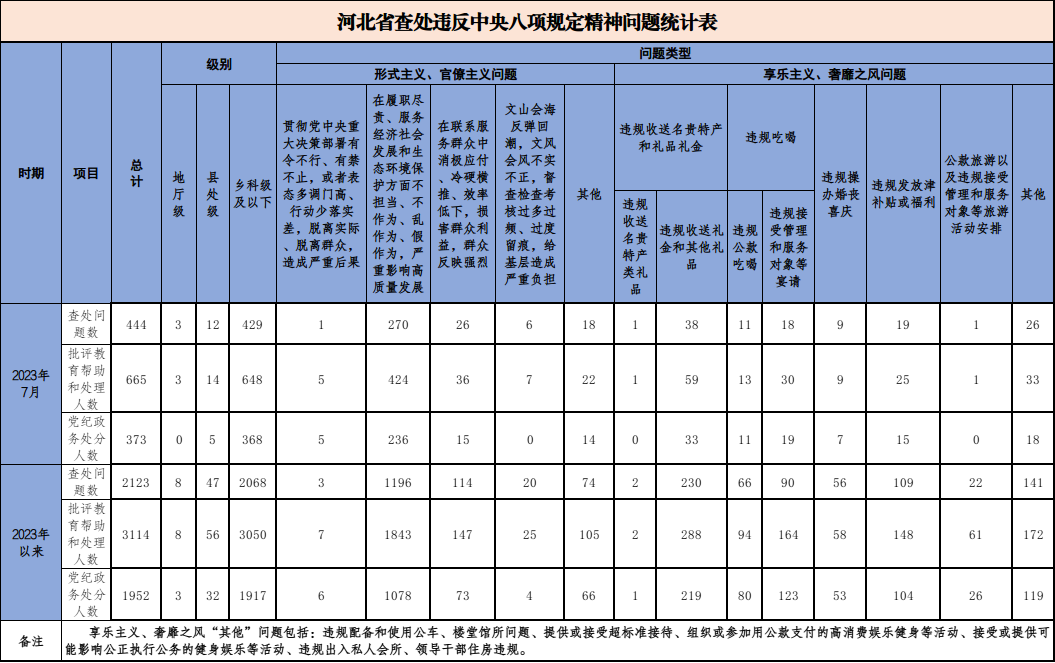 2023年7月,全省各級紀檢監察機關共查處違反中央八項規定精神問題444起,批評教育幫助和處理665人,其中黨紀政務處分373人。