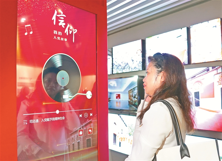 參觀者通過多媒體裝置聆聽普通黨員講述自己的入黨故事。 新華社記者 劉穎 攝