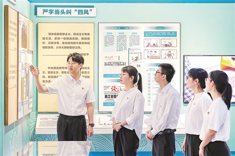 黨的十八大以來,我們黨不斷推進黨的政治建設、思想建設、組織建設、作風建設、紀律建設,把制度建設貫穿黨的各項建設,開展史無前例的反腐敗斗爭,在構建全面從嚴治黨體系上積累了豐富成果。圖為近日,浙江省淳安縣紀委監委干部在省法紀教育基地參觀全面從嚴治黨成就展。謝航凱 攝