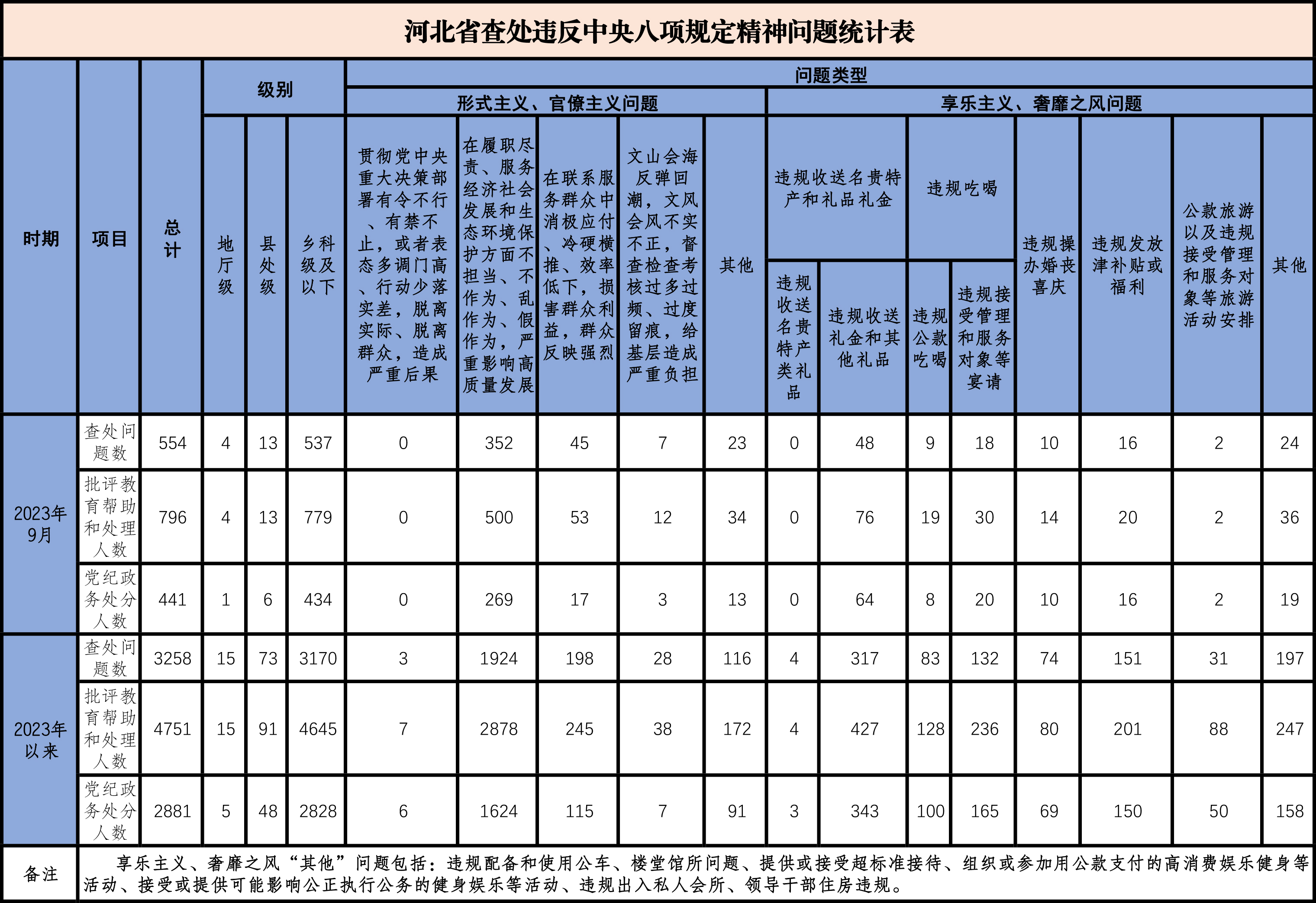 2023年9月,全省各級紀(jì)檢監(jiān)察機(jī)關(guān)共查處違反中央八項(xiàng)規(guī)定精神問題554起,批評教育幫助和處理796人,其中黨紀(jì)政務(wù)處分441人。