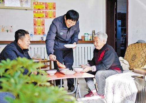 11月9日,涿州市小柳村駐村工作隊隊員在入戶走訪供暖準備情況時,為村民蔡玉仙(右一)送來熱氣騰騰的餃子。蔡玉仙今年80歲,她說房子修好了,還加了保溫層,過冬一定暖和。 河北日報記者 趙威攝