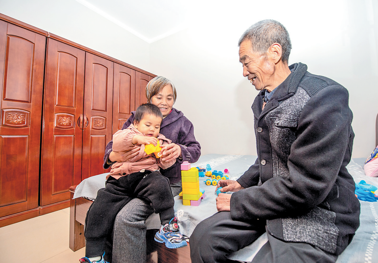11月10日晚,在加固修繕后的房子里,涿州市萬全莊村村民楊佩然(右一)老兩口陪孫子玩耍。河北日報記者 趙 杰攝