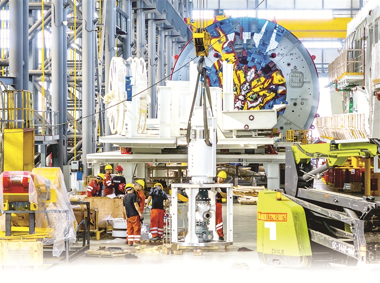 盾構(gòu)機被稱作“工程機械之王”,是衡量一個國家制造業(yè)水平的重要標志。圖為12月11日,廣東省佛山市某公司生產(chǎn)車間內(nèi),工人正在安裝調(diào)試盾構(gòu)組件。 圖片來源:視覺中國