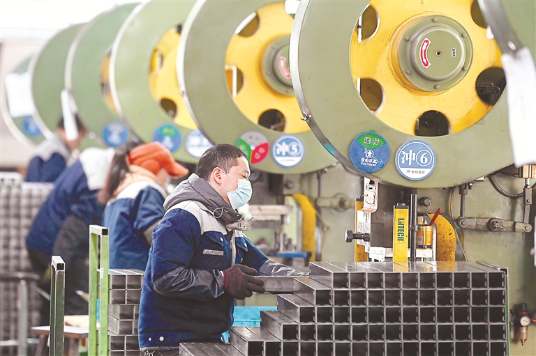近年來,浙江省嵊州市大力發(fā)展以“產(chǎn)業(yè)大腦+未來工廠”為核心的數(shù)字經(jīng)濟(jì),推動(dòng)工業(yè)經(jīng)濟(jì)高質(zhì)量發(fā)展。圖為工人在該市某公司沖壓車間作業(yè)。新華社記者 黃宗治 攝