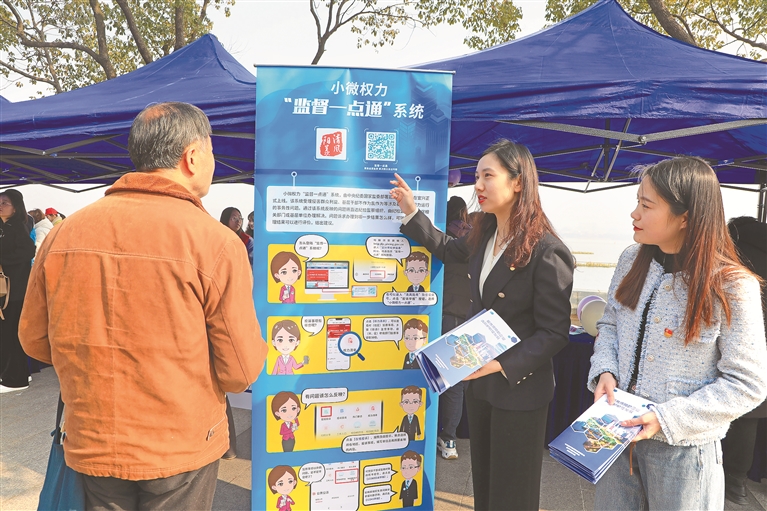 江蘇省宜興市紀委監委開展“清風護航”行動,通過發布區域民營經濟營商環境滿意度調查問卷、發放執法效能評議問卷等舉措,拓寬信訪舉報渠道,廣泛征集問題和訴求,監督壓實責任,優化營商環境。圖為該市紀檢監察干部向群眾介紹如何通過“小微權力一點通”平臺反映問題。褚亮 攝