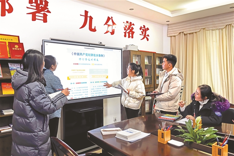 江西省崇義縣紀委監委將紀法學習作為紀檢監察干部“必修課”,常態化組織開展集體學習和交流研討。圖為近日,該縣紀檢監察干部對新修訂的《中國共產黨紀律處分條例》開展學習交流。 廖寶海 攝