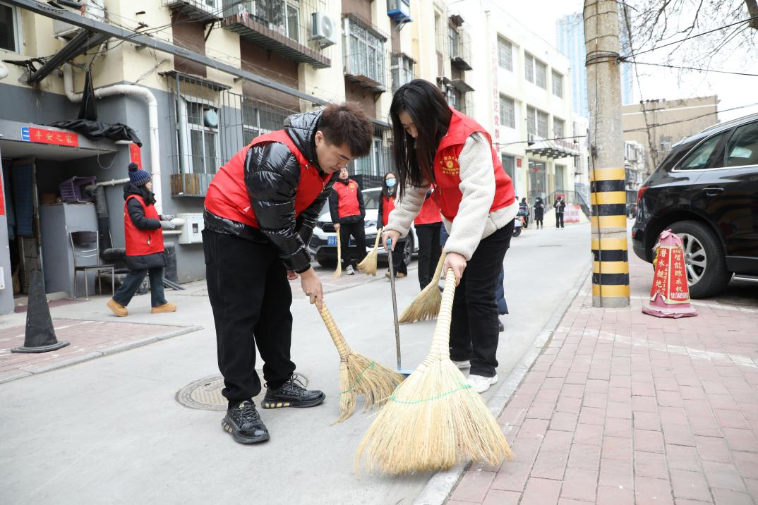 圖為黨員志愿者與社區(qū)志愿者開展環(huán)境衛(wèi)生義務(wù)勞動(dòng)。