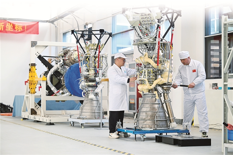 以科技創(chuàng)新為引領(lǐng),以工業(yè)制造業(yè)為支撐,安徽正在一條條新賽道上培育發(fā)展新質(zhì)生產(chǎn)力。圖為安徽某航天技術(shù)有限公司生產(chǎn)基地,技術(shù)人員對(duì)即將交付的液體火箭發(fā)動(dòng)機(jī)做檢查。新華社發(fā)