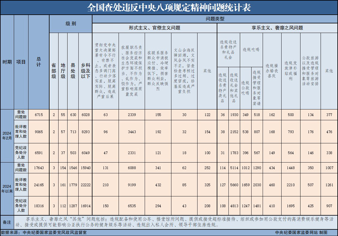 3月26日,中央紀委國家監委公布了2024年2月全國查處違反中央八項規定精神問題匯總情況。當月,全國共查處違反中央八項規定精神問題6715起,批評教育和處理9065人,其中黨紀政務處分6591人,這是連續第126個月公布月報數據。