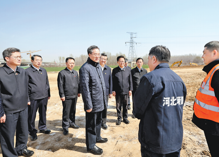 三月三十日至三十一日,中共中央政治局常委、國務院副總理丁薛祥在北京房山、河北涿州調研,并在涿州主持召開座談會。這是三十一日上午,丁薛祥在河北保定北拒馬河涿州段應急防洪治理工程建設現場調研。 新華社記者 丁海濤攝