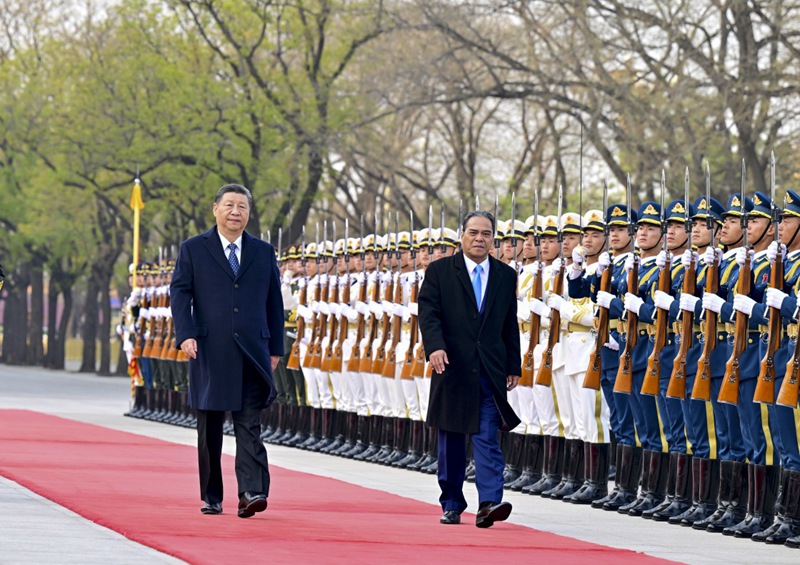 4月9日下午,國家主席習近平在北京人民大會堂同來華進行國事訪問的密克羅尼西亞聯邦總統西米納舉行會談。這是會談前,習近平在人民大會堂東門外廣場為西米納舉行歡迎儀式。新華社記者 岳月偉 攝