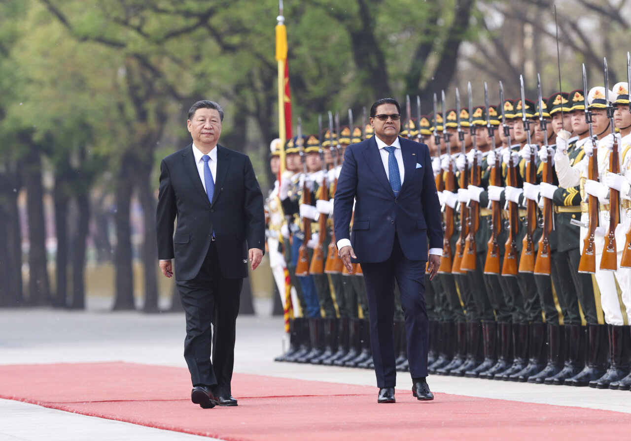 4月12日下午,國家主席習近平在北京人民大會堂同來華進行國事訪問的蘇里南總統單多吉舉行會談。這是會談前,習近平在人民大會堂東門外廣場為單多吉舉行歡迎儀式。新華社記者 丁海濤 攝