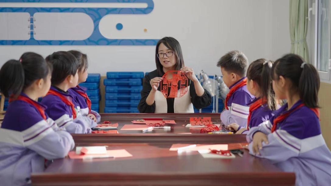 圖為老師向同學們講解剪紙“廉”文化的內涵。