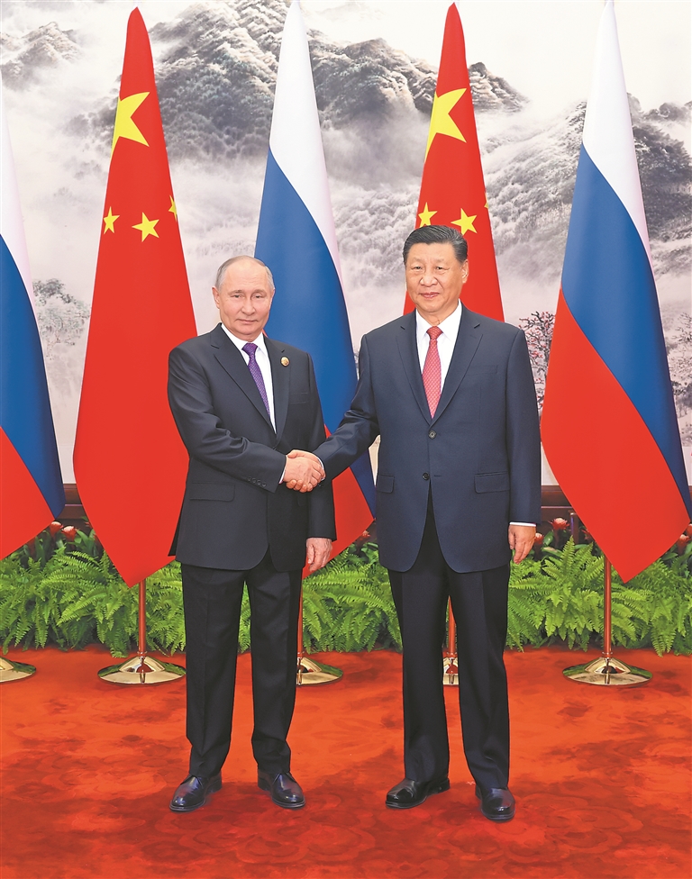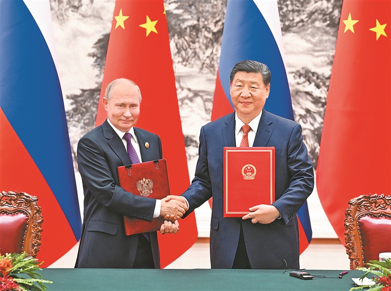 習(xí)近平強調(diào),中俄關(guān)系75年發(fā)展歷史得出的最重要結(jié)論,就是兩個相鄰的大國之間,必須始終弘揚和平共處五項原則,相互尊重、平等互信、照顧彼此關(guān)切,真正為雙方的發(fā)展振興相互提供助力。這既是中俄兩國正確相處之道,也是21世紀(jì)大國關(guān)系應(yīng)該努力的方向。中俄關(guān)系有著深厚的歷史積淀和堅實的民意基礎(chǔ),雙方要密切戰(zhàn)略協(xié)作和互利合作,堅定地走自己的發(fā)展道路,堅定維護(hù)國際公平正義。