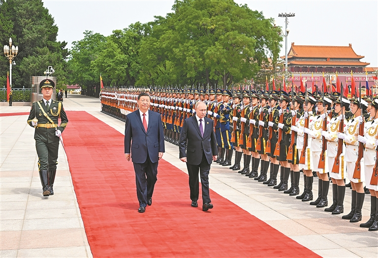 5月16日上午,國家主席習(xí)近平在北京人民大會堂同來華進(jìn)行國事訪問的俄羅斯總統(tǒng)普京舉行會談。這是會談前,習(xí)近平在人民大會堂東門外廣場為普京舉行隆重歡迎儀式。新華社記者 饒愛民 攝