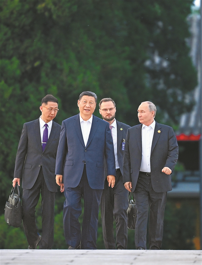 習近平在瀛臺橋前迎接普京。兩國元首邊走邊談,看亭臺樓榭,賞萬物并秀。