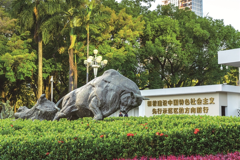深圳是改革開放的第一批試點城市之一,圖為深圳市委門口的拓荒牛雕塑,該雕塑也叫孺子牛,有著開拓進取的寓意。 圖片來源:視覺中國