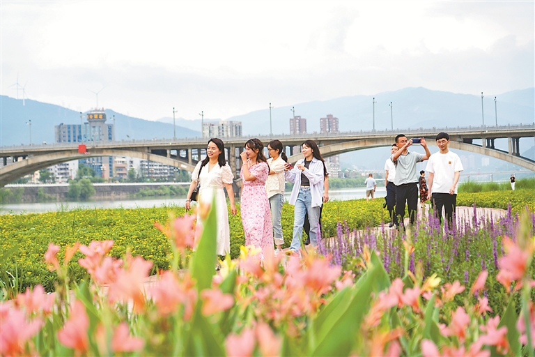 近年來,四川省廣元市堅持“生態優先、綠色發展”,積極開展河道水生態修復,改善城市生態環境,讓人民群眾享受到城市發展帶來的生態福祉。圖為近日,市民在位于廣元市內的濱江路步行棧道游覽觀光。 圖片來源:視覺中國