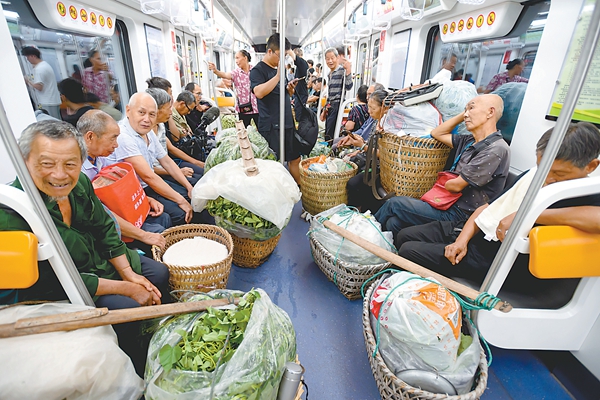 推進社會體制改革意味著要聚焦民生關(guān)切,兜住兜牢民生底線。在重慶,有一條“背簍專線”。連接渝北區(qū)石船鎮(zhèn)和市區(qū)的軌道交通4號線開通后,不少老鄉(xiāng)背著背簍、搭地鐵去城里賣菜。圖為近日,菜農(nóng)乘坐重慶軌道交通4號線前往市區(qū)賣菜。 圖片來源:視覺中國