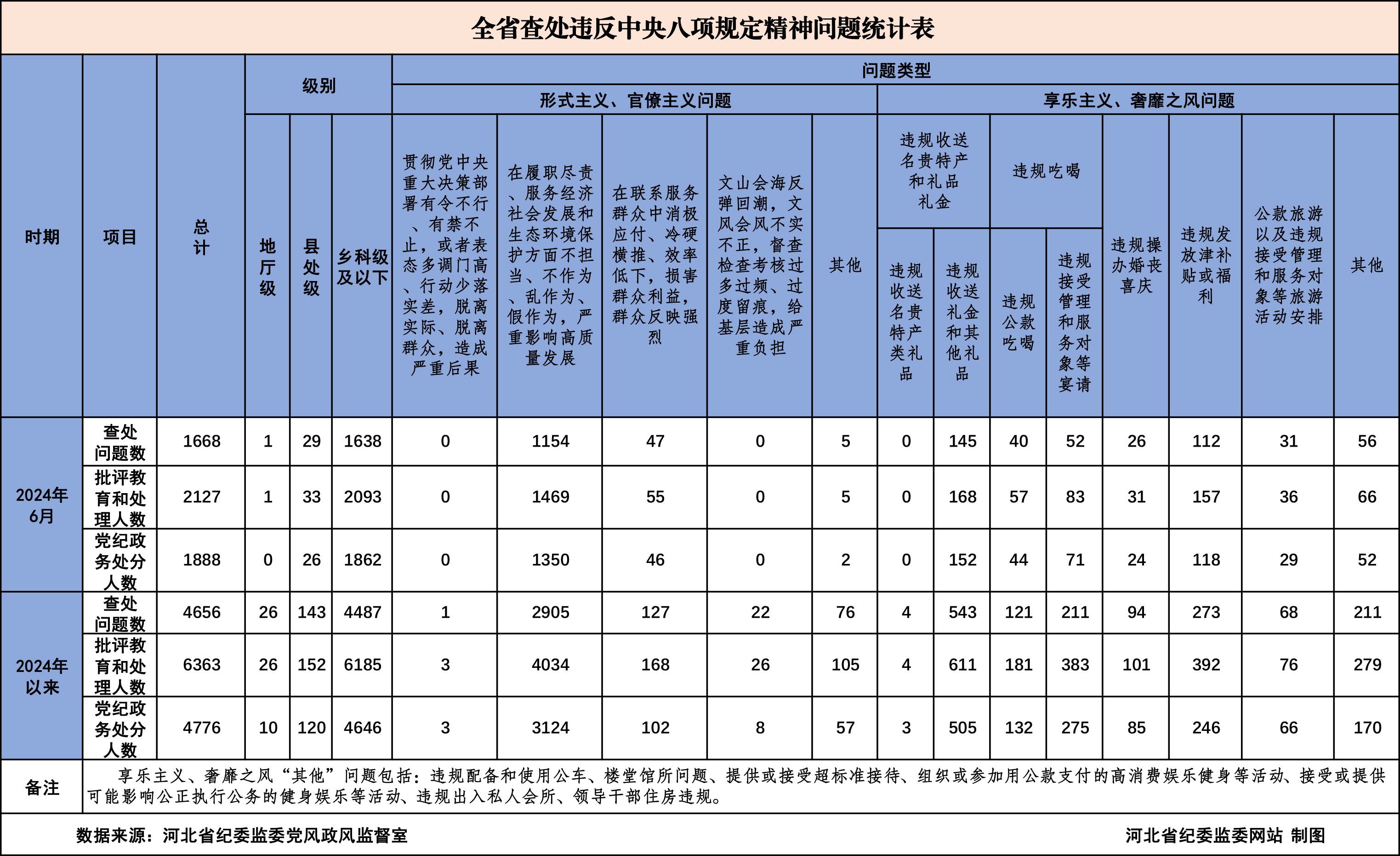 今年6月,全省共查處違反中央八項規定精神問題1668起,批評教育和處理2127人,其中黨紀政務處分1888人。