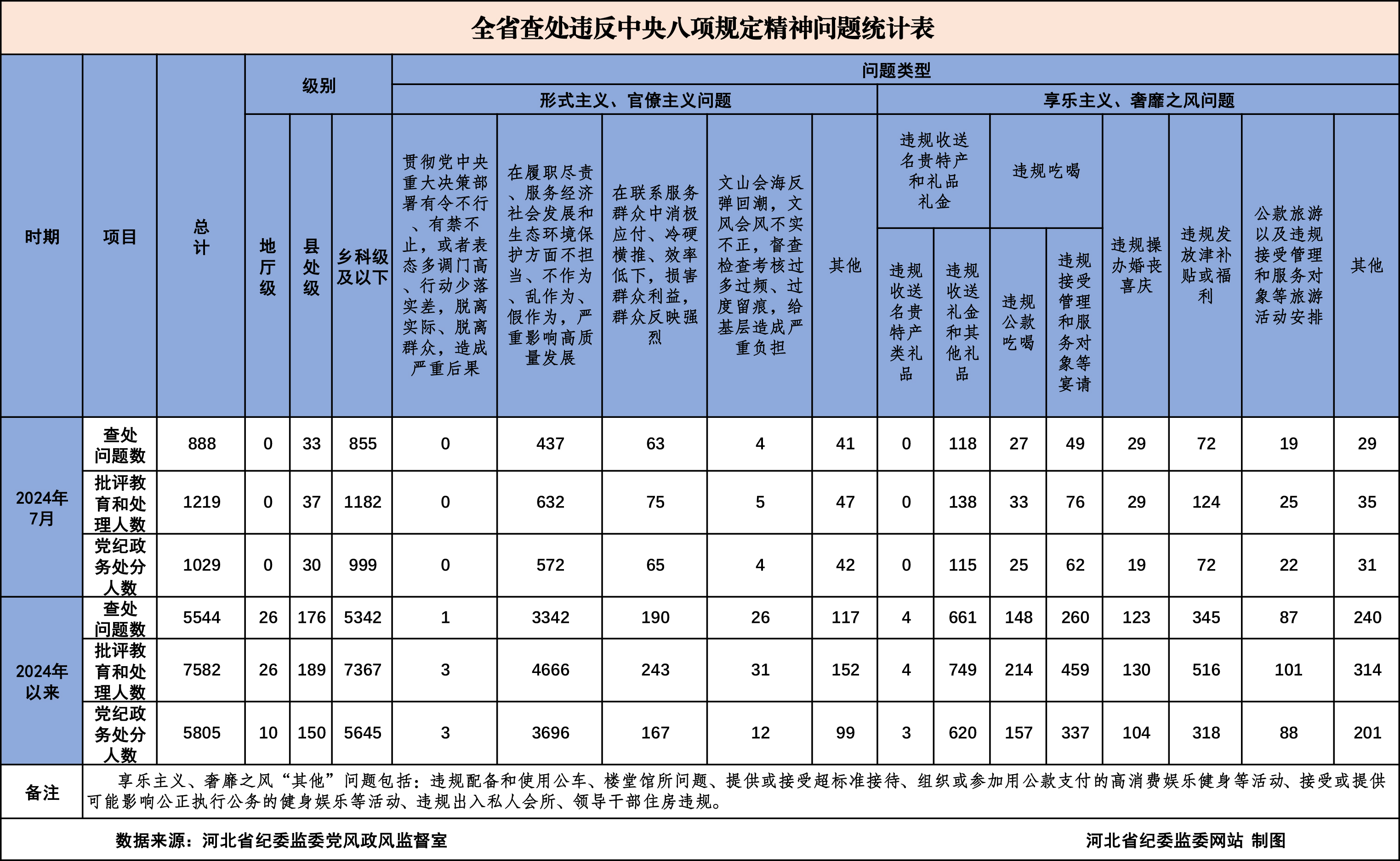 今年7月,全省共查處違反中央八項規定精神問題888起,批評教育和處理1219人,其中黨紀政務處分1029人。