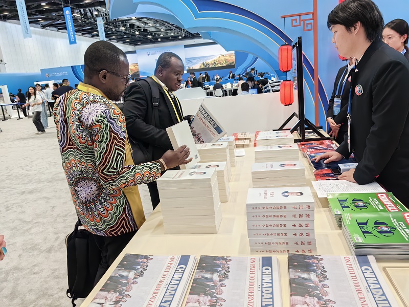 圖為科特迪瓦通訊社記者領取宣傳品展臺上的圖書。呂佳蓉 攝