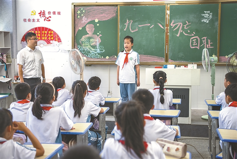 9月18日,安徽省蕪湖市繁昌區繁陽鎮城關一小舉辦“銘記歷史 勿忘國恥”主題班會。 圖片來源:視覺中國