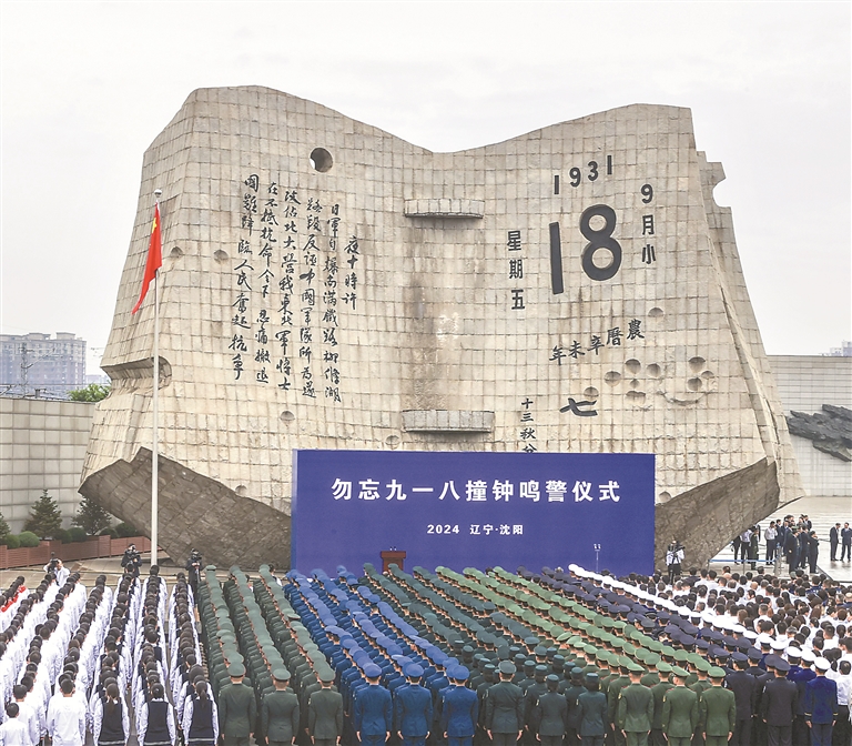 9月18日,勿忘“九一八”撞鐘鳴警儀式在遼寧省沈陽市“九·一八”歷史博物館殘歷碑廣場舉行。
