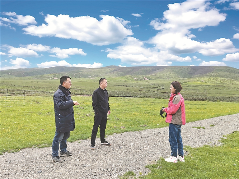 圖為近日,四川省阿壩藏族羌族自治州松潘縣紀委監委干部在毛兒蓋鎮草原村,查看黃河支流生態防護帶退化草地治理項目建設推進情況。唐夢姣 攝