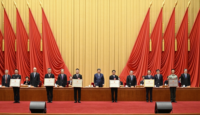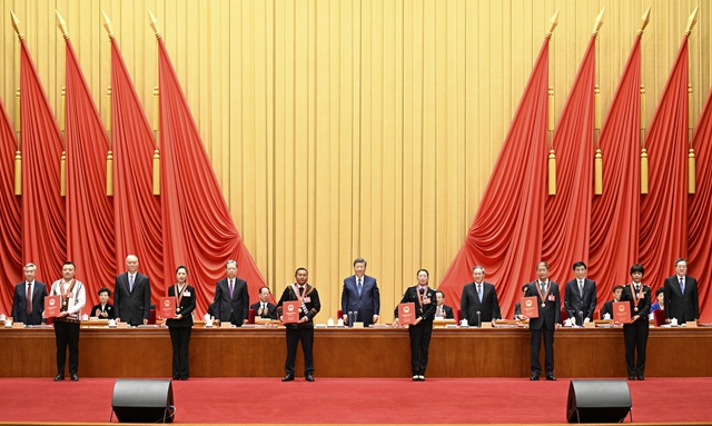 在歡快的樂曲聲中,習近平等為受表彰的模范個人和模范集體代表頒獎。