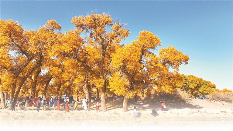 新時代以來,覆蓋全面、務實管用、嚴格嚴密的中國特色社會主義生態環境保護法律體系初步形成,有力保障了生態文明體制改革的深入推進。圖為游客在內蒙古自治區阿拉善盟額濟納旗額濟納胡楊林旅游區游玩。新華社發