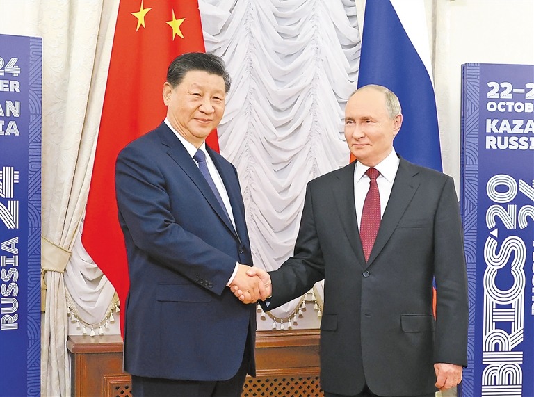 習近平強調,明年是聯合國成立80周年,也是世界反法西斯戰爭勝利80周年。作為聯合國安理會常任理事國和世界主要大國,中俄要深化全面戰略協作,密切在聯合國、上海合作組織等多邊框架內溝通協調,弘揚正確二戰史觀,堅定維護以聯合國為核心的國際體系,共同維護全球戰略穩定,維護國際公平正義。