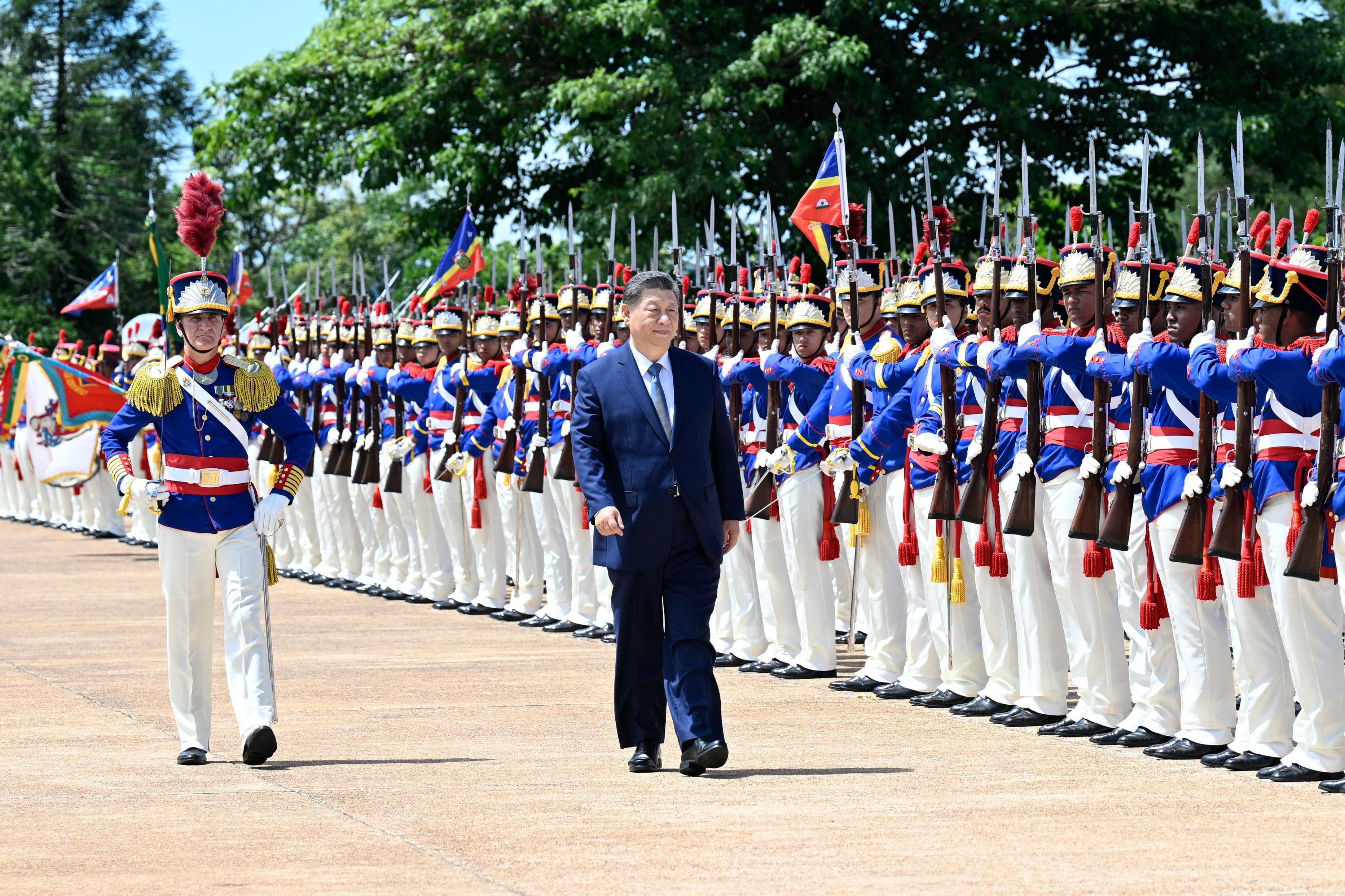 軍樂團(tuán)奏中巴兩國國歌。兩國元首一同觀看儀仗隊(duì)分列式。中巴兒童揮舞兩國國旗熱烈歡迎習(xí)近平。巴西藝術(shù)家用中文演唱《我的祖國》。