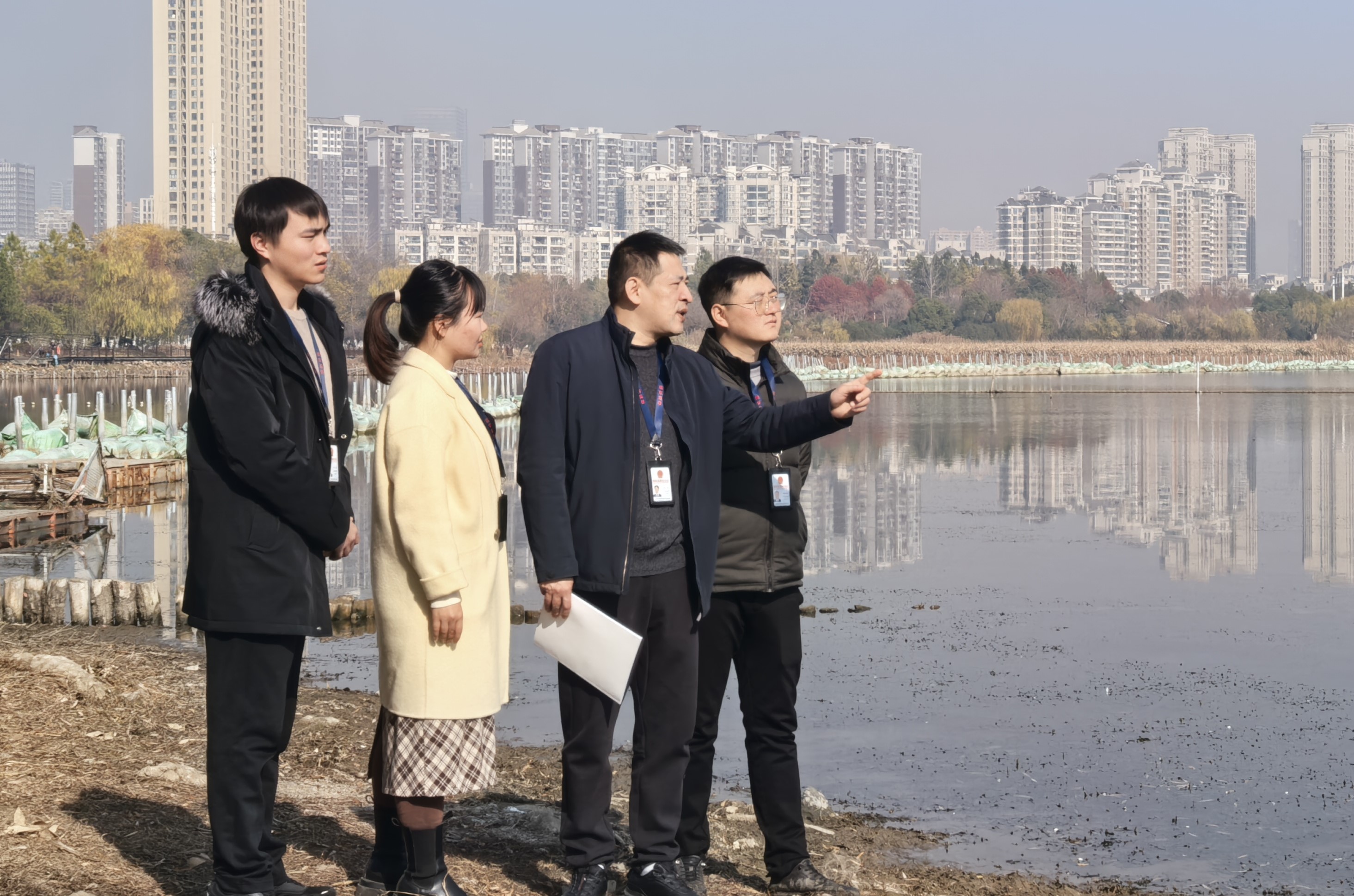 圖為2024年12月31日,湖北省武漢市武昌區紀檢監察干部正在實地查看外沙湖水生態系統治理成效。童晶 攝