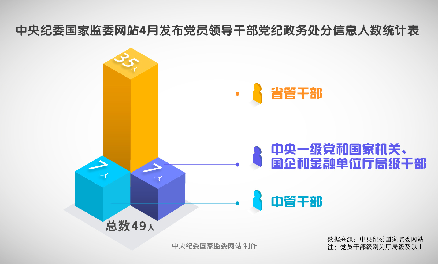 2025年4月,中央紀委國家監委網站共發布49條黨紀政務處分信息。其中,中管干部7人,中央一級黨和國家機關、國企和金融單位廳局級干部7人,省管干部35人。