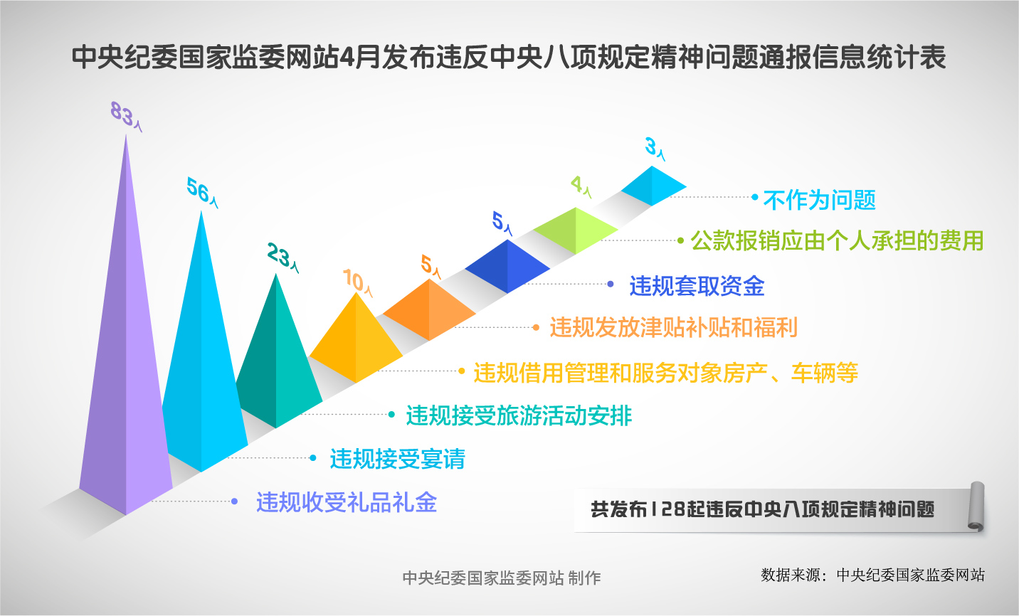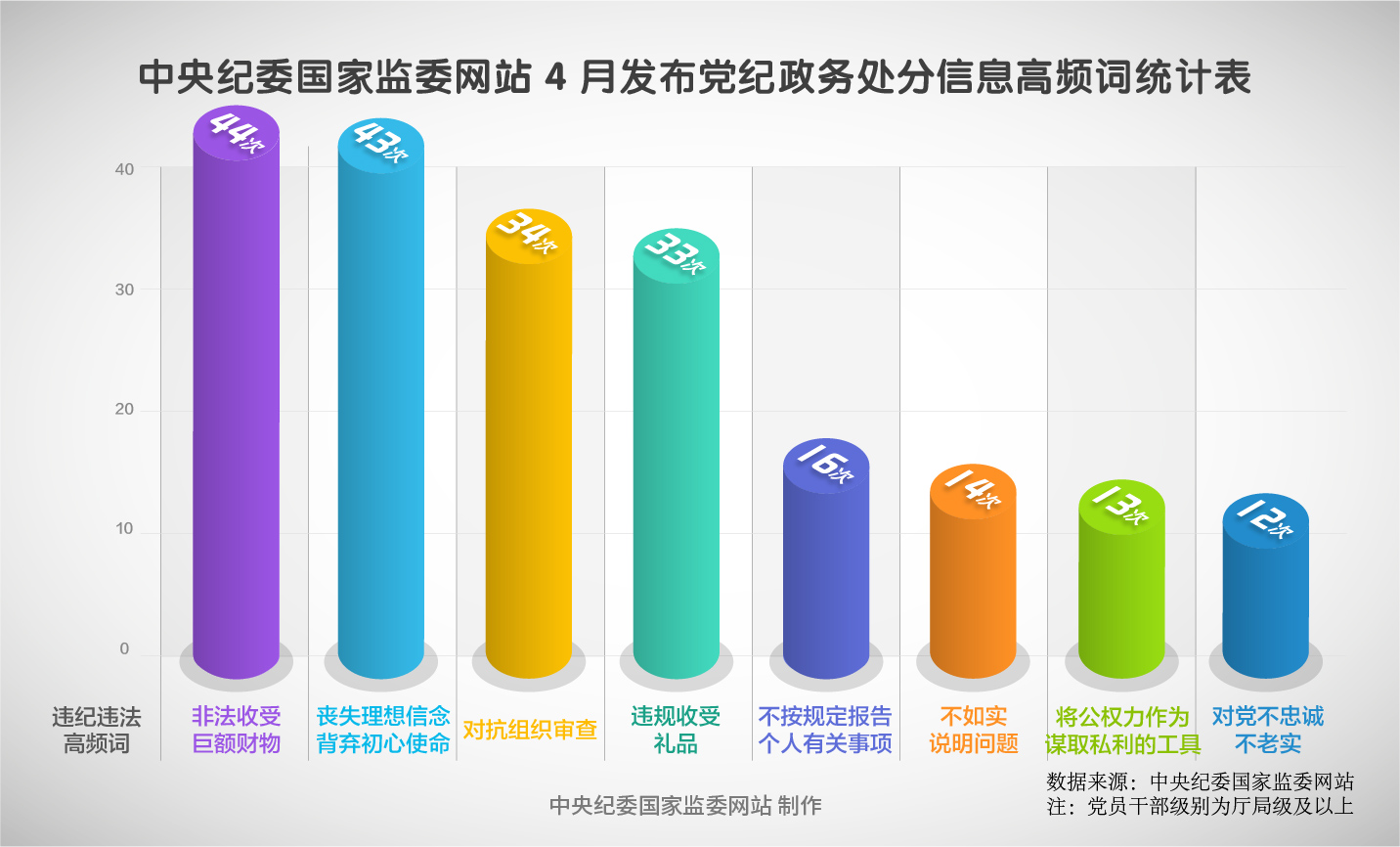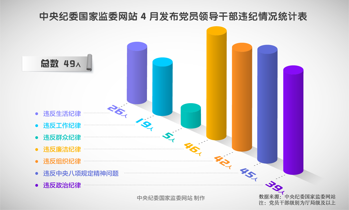 2025年4月,在中央紀委國家監委網站發布的49條黨紀政務處分通報中,46人違反廉潔紀律,45人違反中央八項規定精神問題,42人違反組織紀律,39人違反政治紀律,26人違反生活紀律,19人違反工作紀律,5人違反群眾紀律。
