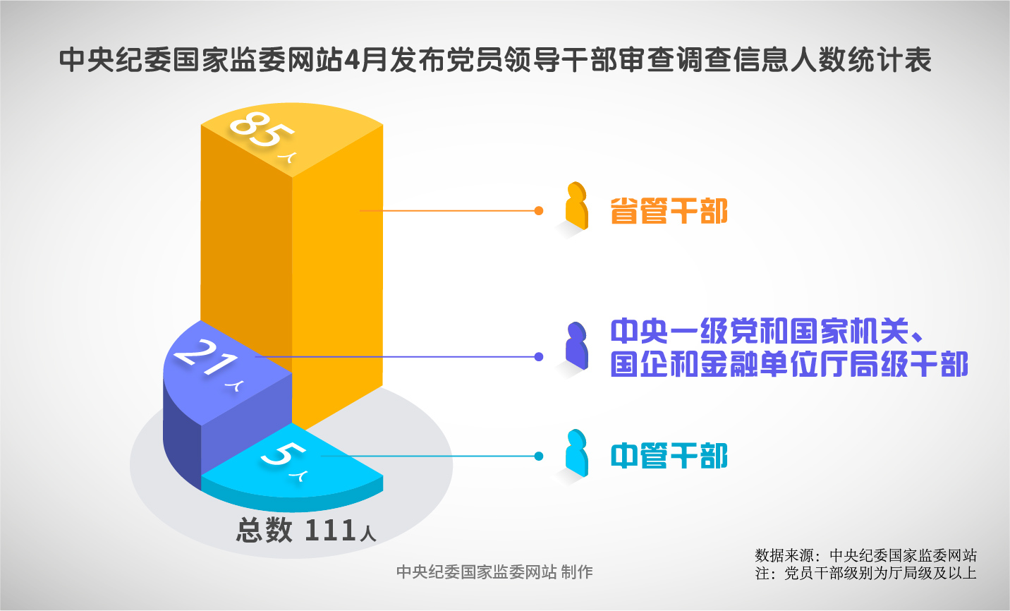 2025年4月,中央紀委國家監委網站共發布111條審查調查信息。其中,中管干部5人,中央一級黨和國家機關、國企和金融單位廳局級干部21人,省管干部85人。