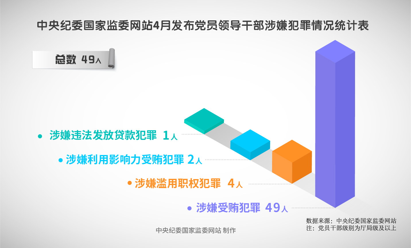 根據2025年4月中央紀委國家監委網站發布的49條黨紀政務處分信息,涉嫌受賄犯罪的黨員領導干部人數達49人。其他涉嫌犯罪情況包括:涉嫌濫用職權犯罪、涉嫌利用影響力受賄犯罪、涉嫌違法發放貸款犯罪,分別為4次、2次、1次。