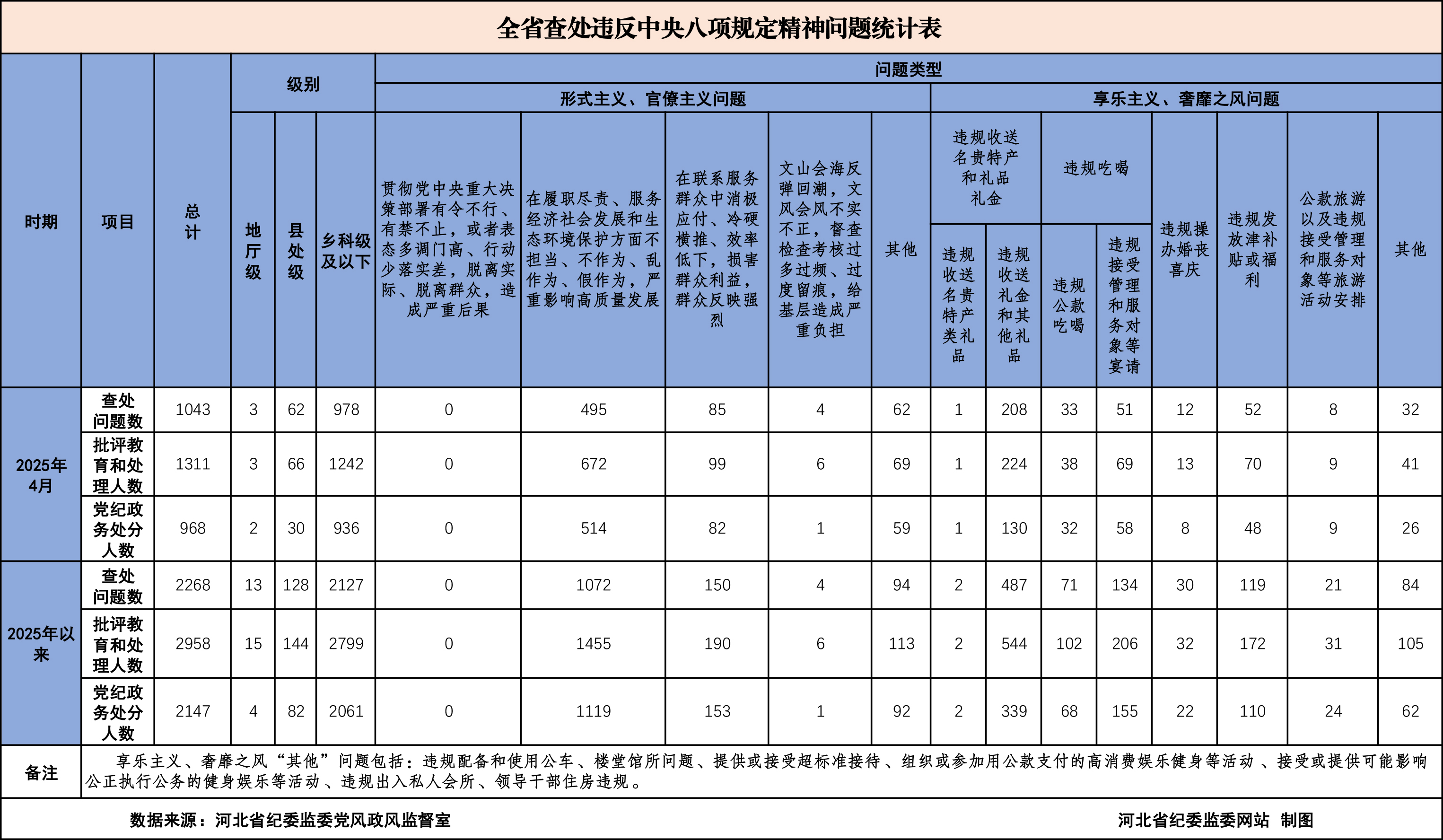 今年4月,全省共查處違反中央八項規定精神問題1043起,批評教育和處理1311人,其中黨紀政務處分968人。