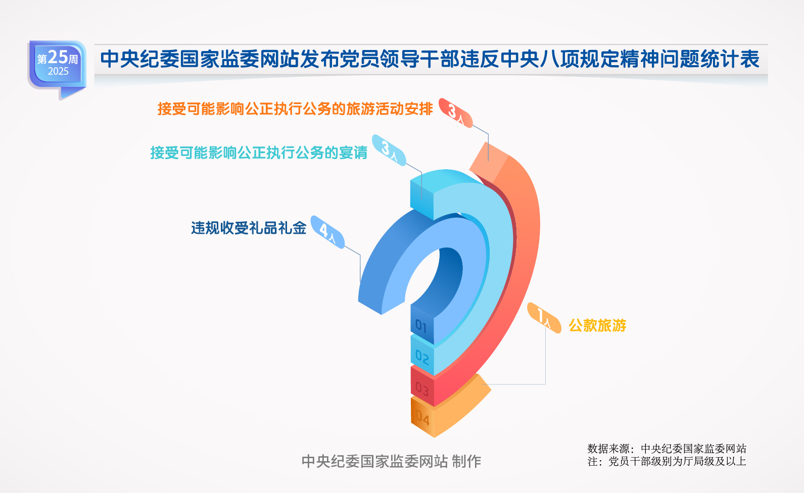 2025年第25周,在中央紀委國家監委網站發布的黨紀政務處分通報中,被處分黨員領導干部均違反中央八項規定精神。其中,4人違規收受禮品禮金,3人接受可能影響公正執行公務的宴請,3人接受可能影響公正執行公務的旅游活動安排,1人公款旅游。