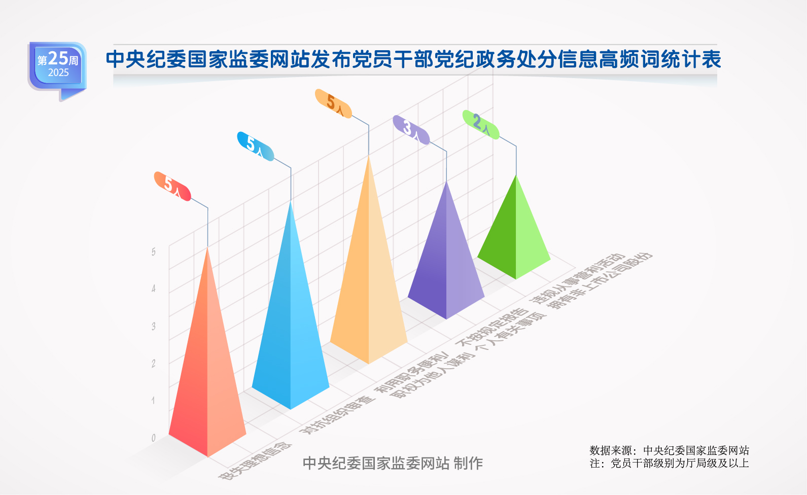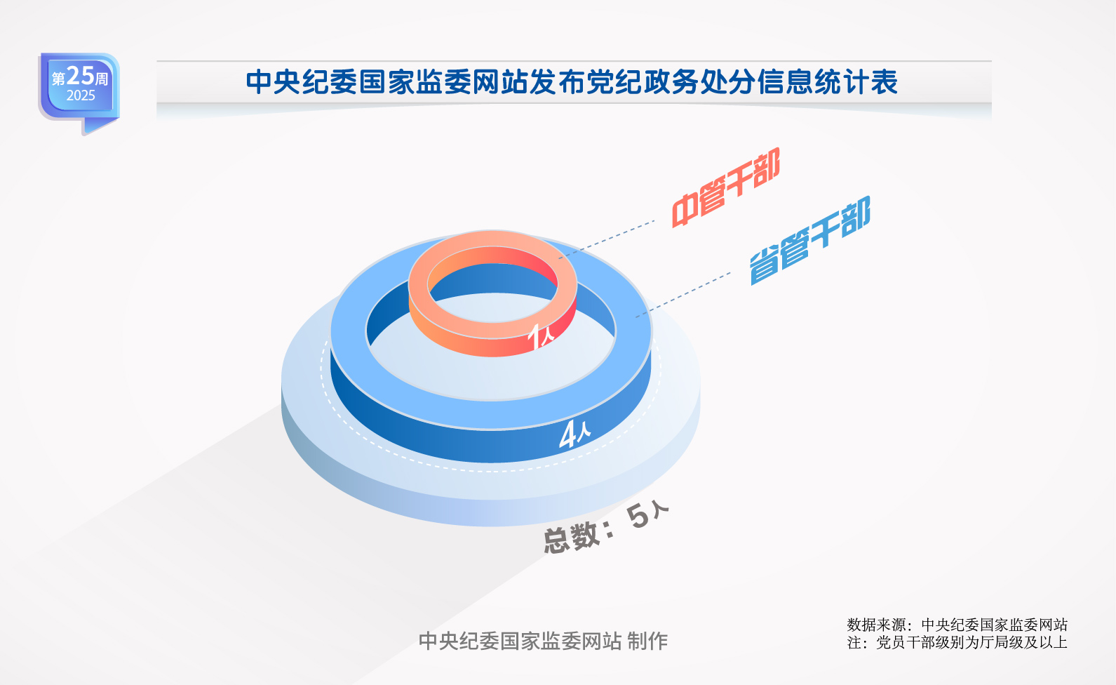 2025年第25周,中央紀委國家監委網站共發布5條黨紀政務處分信息。其中,中管干部1人,省管干部4人。