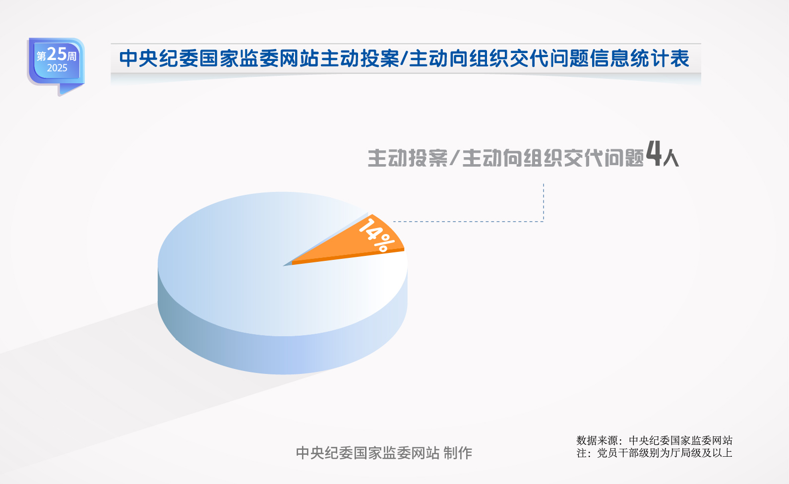 2025年第25周,中央紀委國家監委網站發布的審查調查信息中,3名黨員領導干部主動投案,1名黨員領導干部主動向組織交代問題。