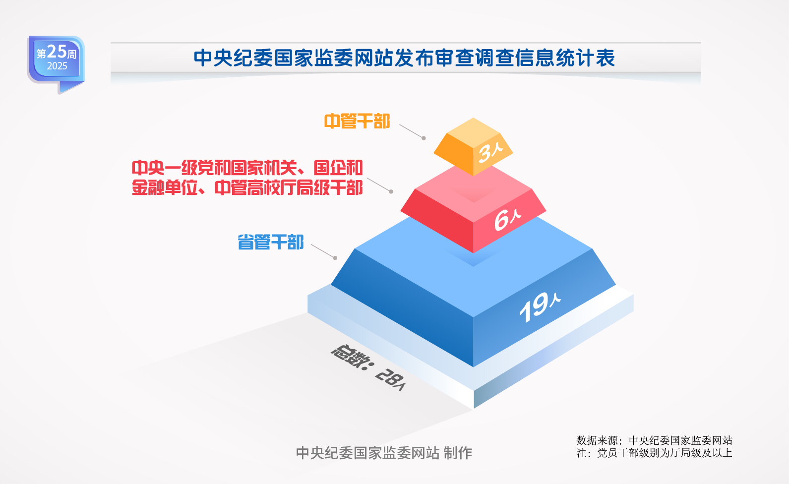 2025年第25周,中央紀委國家監委網站共發布28條審查調查信息。其中,中管干部3人,中央一級黨和國家機關、國企和金融單位、中管高校廳局級干部6人,省管干部19人。