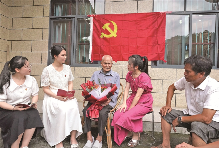 6月28日,廣西柳州,融水苗族自治縣融水鎮(zhèn)西廓村里,百歲老黨員李炳和在給青年黨員講黨史,重溫革命故事、傳承紅色基因。 圖片來源:視覺中國
