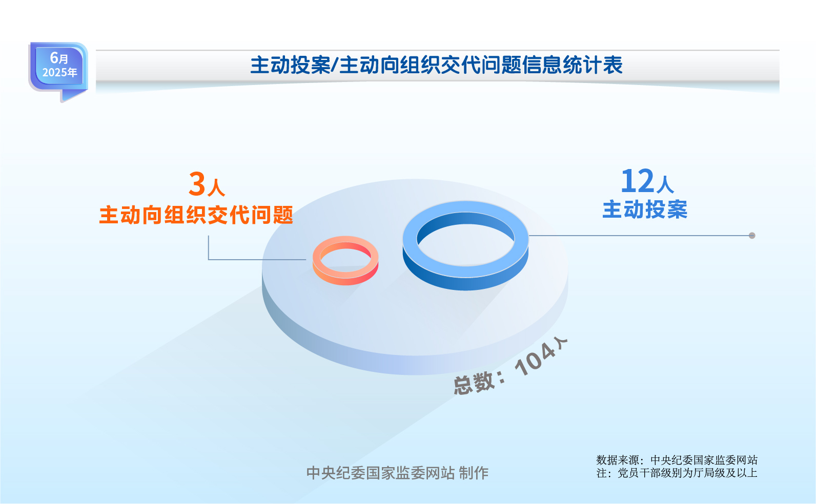 2025年6月,中央紀(jì)委國家監(jiān)委網(wǎng)站發(fā)布的審查調(diào)查信息中,12名黨員領(lǐng)導(dǎo)干部主動投案,3名黨員領(lǐng)導(dǎo)干部主動向組織交代問題。