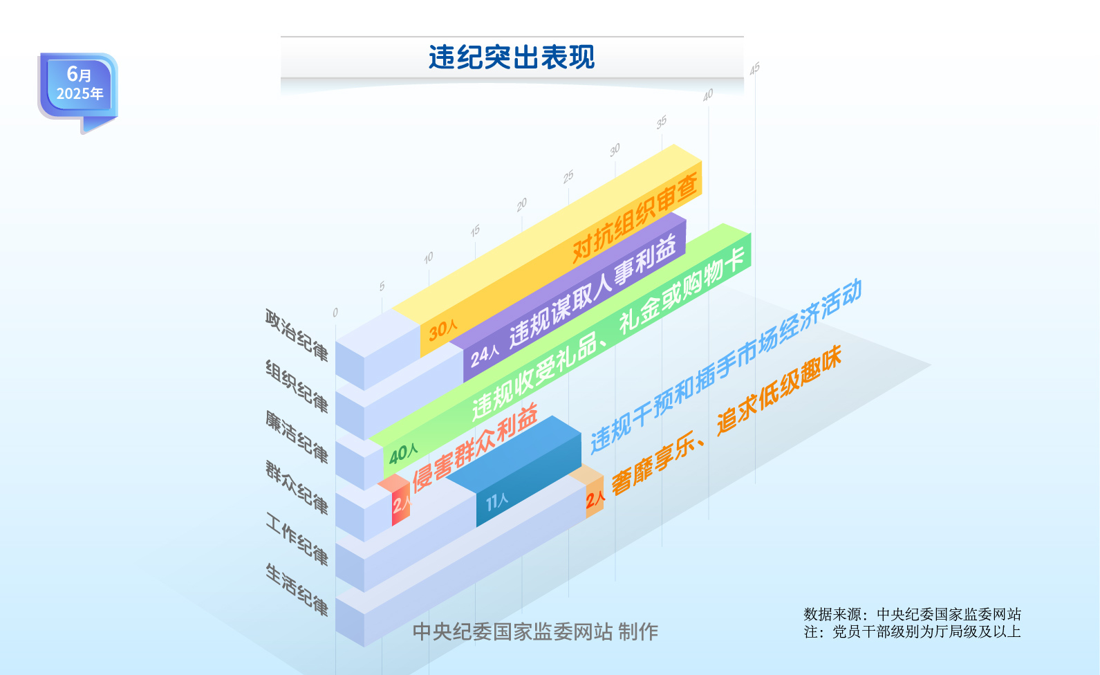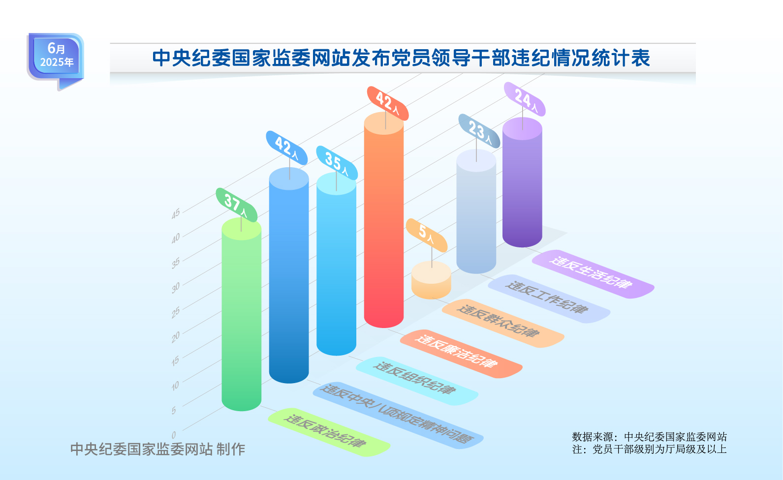 2025年6月,中央紀(jì)委國家監(jiān)委網(wǎng)站發(fā)布的黨紀(jì)政務(wù)處分信息中,42名被處分黨員領(lǐng)導(dǎo)干部均存在違反廉潔紀(jì)律和違反中央八項規(guī)定精神問題,37人違反政治紀(jì)律,35人違反組織紀(jì)律,5人違反群眾紀(jì)律,23人違反工作紀(jì)律,24人違反生活紀(jì)律。